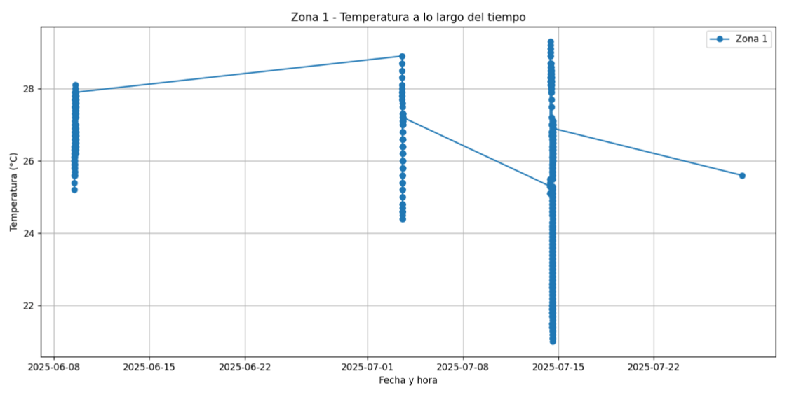 The second issue (and probably the most critical) has appeared when attempting to visualize certain parameters as a time series. Since “Zone 1 Temperature” is among the variables with the highest proportion of non-null values, it has been selected as a test case. However, when plotted (Figure 5), the result has not been as expected. Despite more than one month between the first and last recorded data points, the dataset only contains measurements of four specific days: June 9, July 3, July 14 and July 28. In other words, all data are concentrated on just these four dates, which introduces a significant sampling bias and makes it impossible to do a meaningful analysis of changes across a full month.