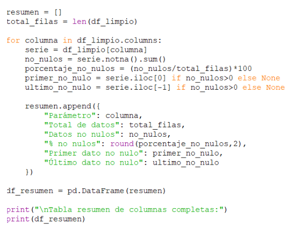 As explained before, the summary includes, among other measures, the percentage of usable (non-null) data. This highlights the first issue: most parameters contain less than 30% of non-null values. It should also be noted that outliers have not yet been handled in this stage.
